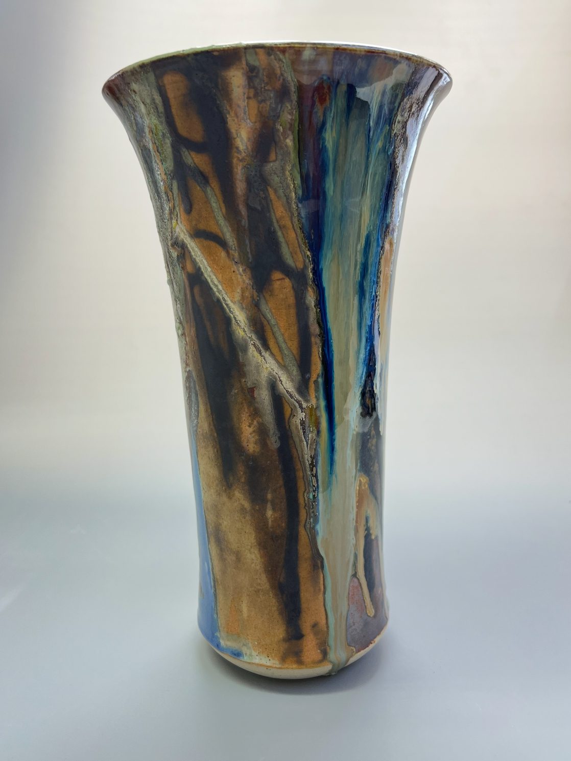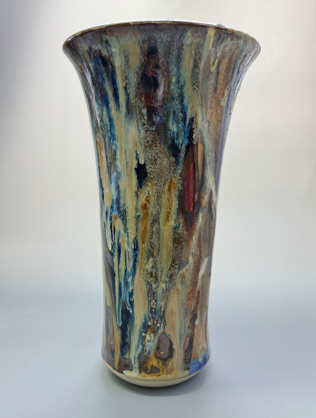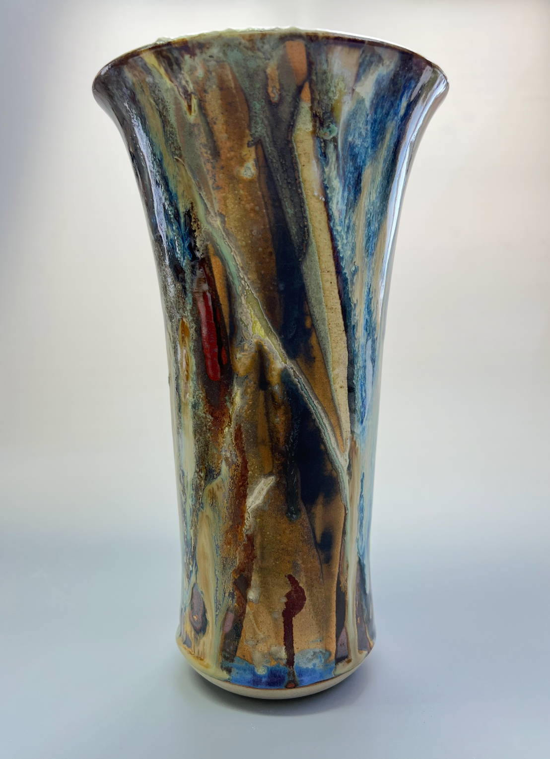 Vertical cylinder with combination of volcanic textures and layers of iron and rutile.