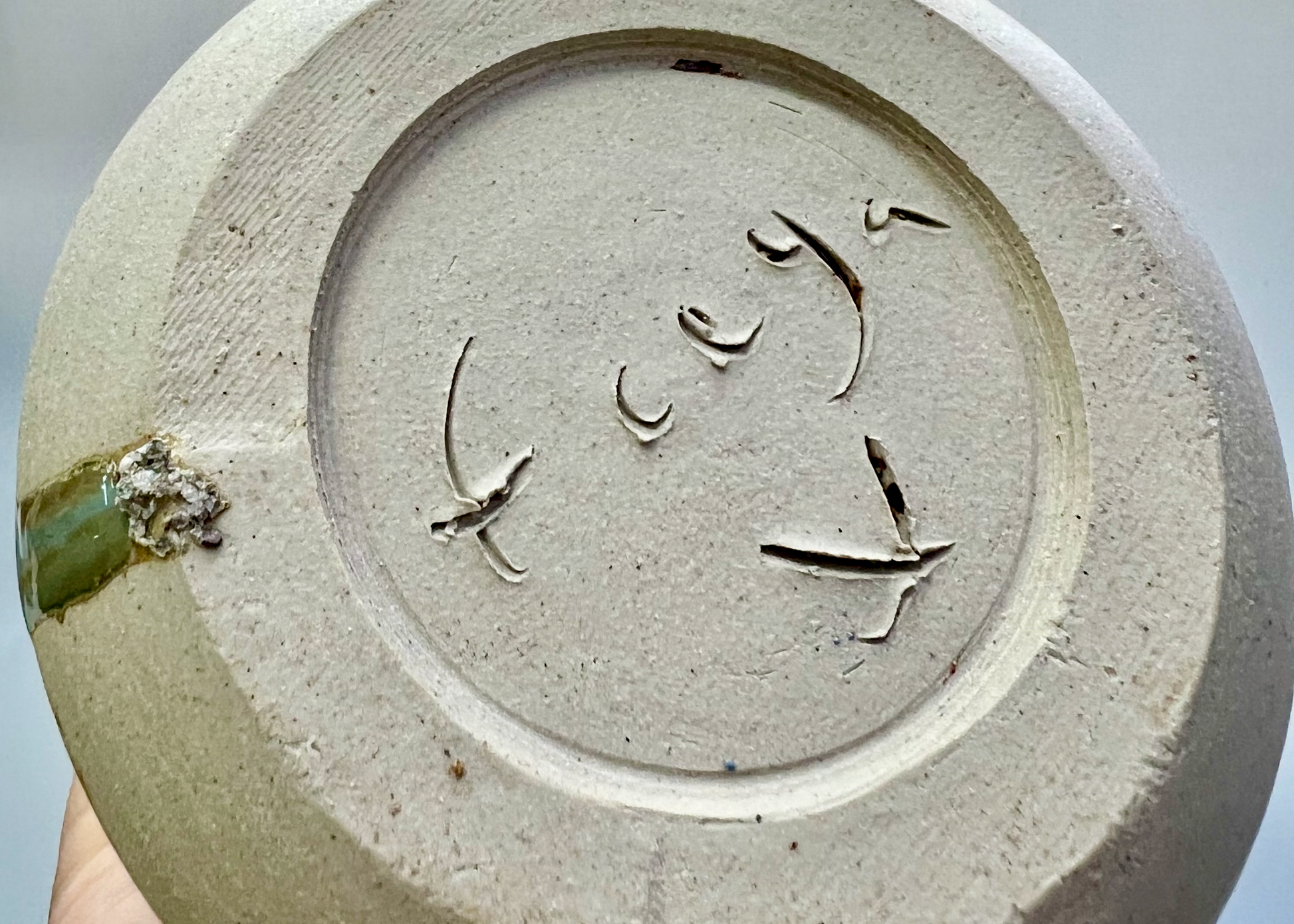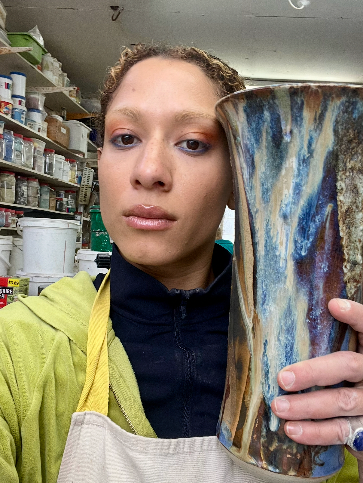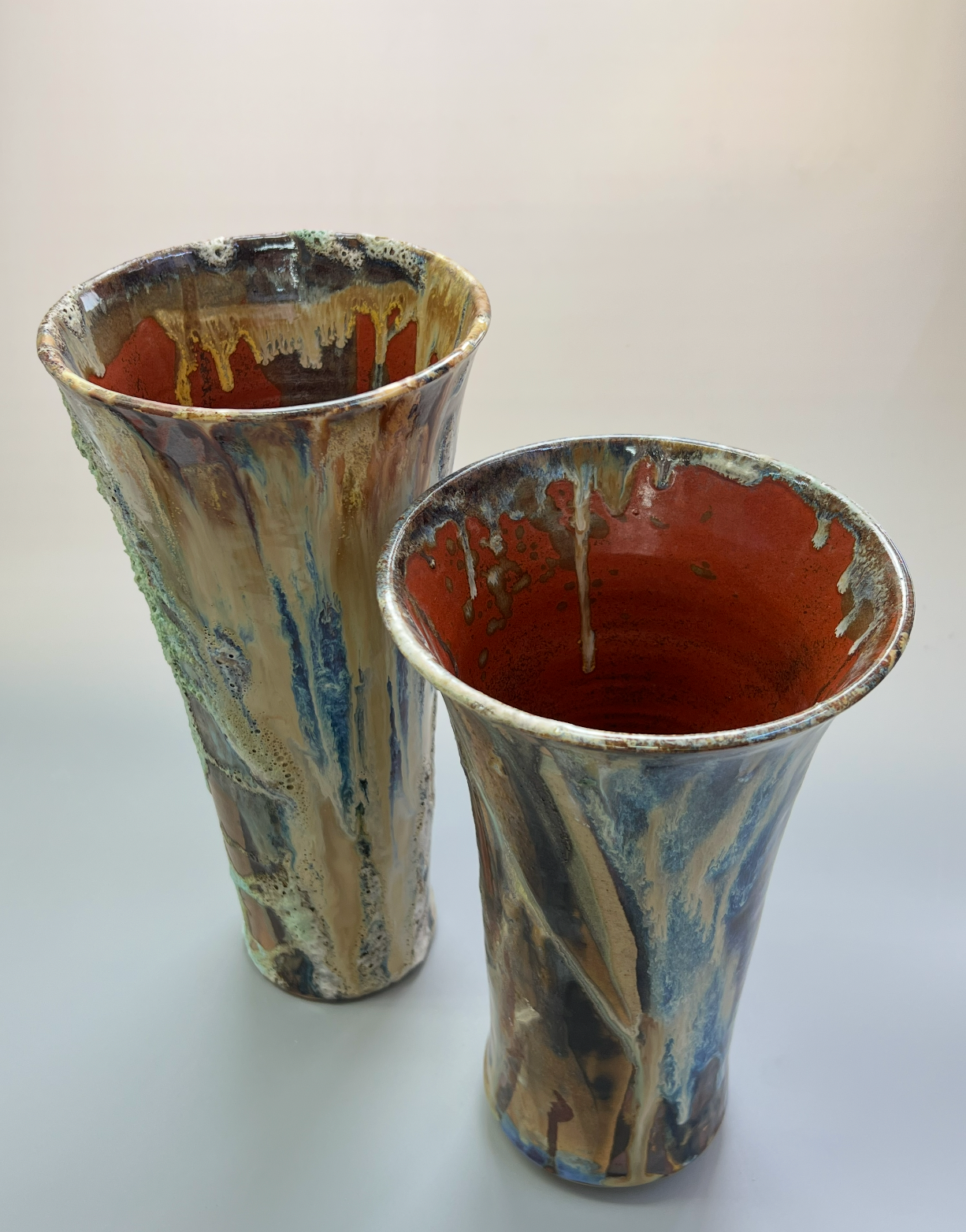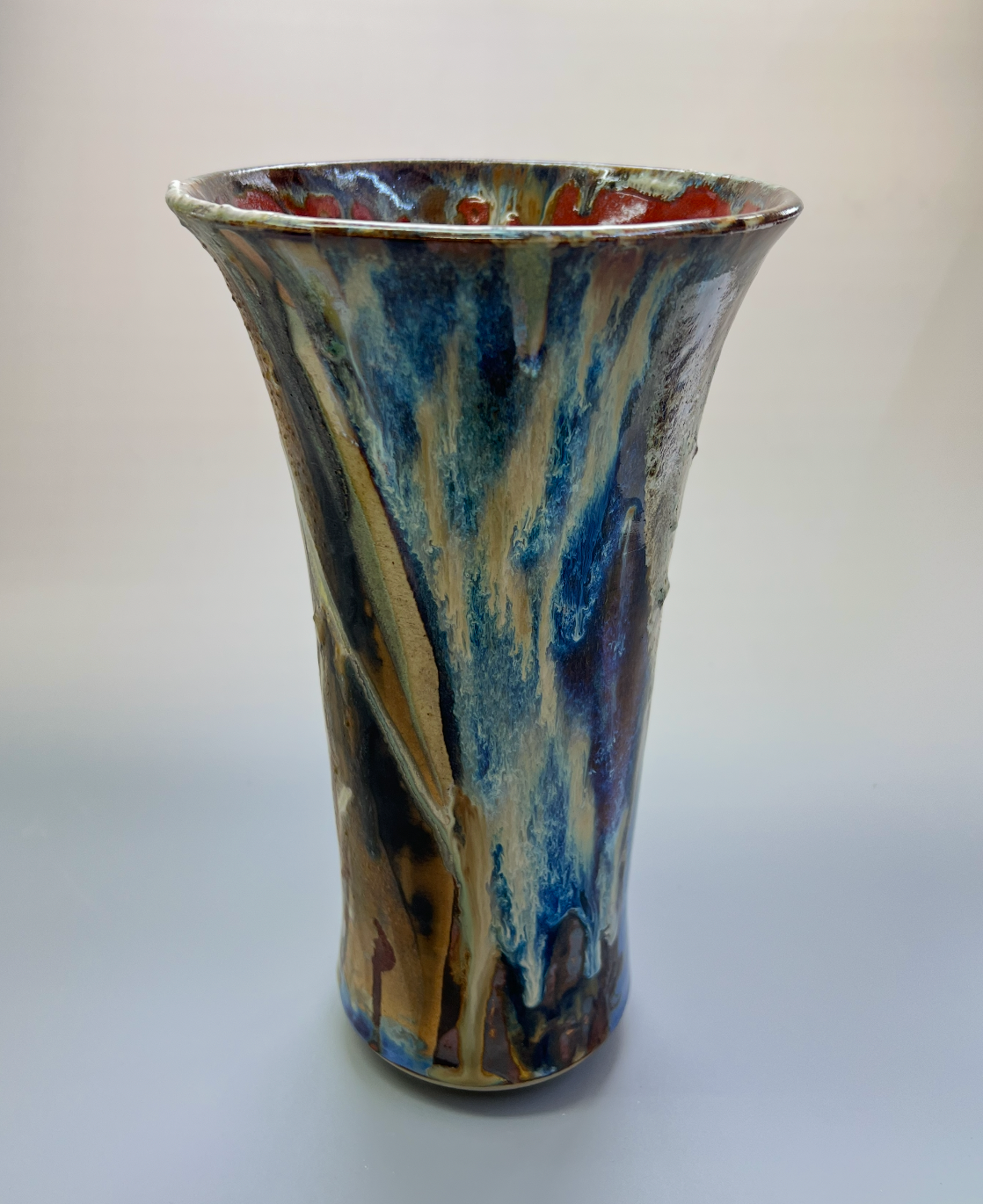 Vertical cylinder with combination of volcanic textures and layers of iron and rutile.