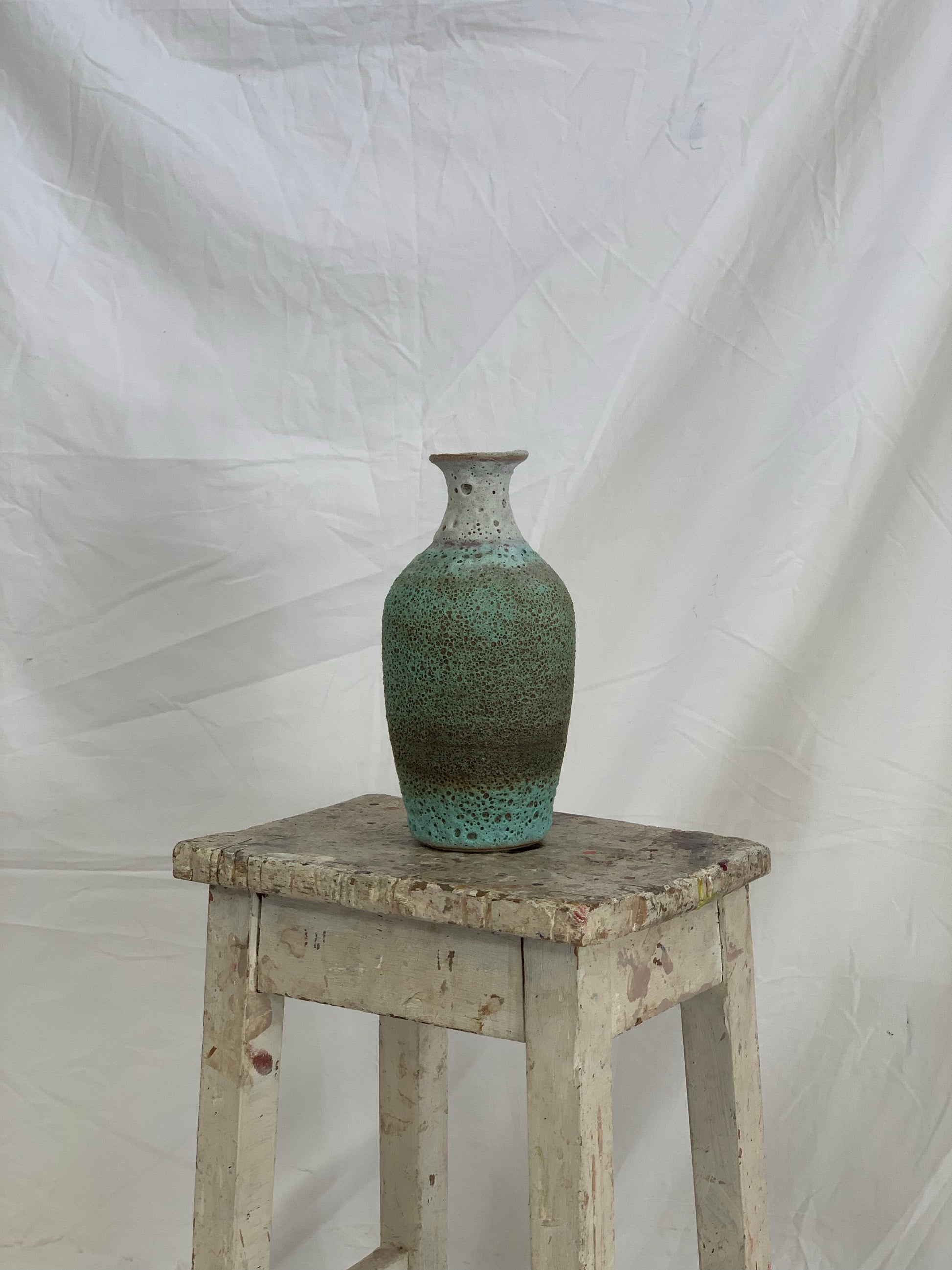 Copper green and off-white vase drenched in a volcanic glaze.